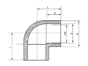 90°彎頭主要連接尺寸(連接方式,熱熔承插)